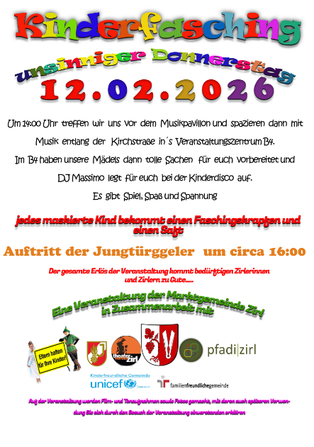 Am Unsinnigen Donnerstag veranstaltet der Theaterverein Zirl mit den Pfadi's und der Jungfeuerwehr unter der Schirmherrschaft von der Marktgemeinde Zirl den Kinderfasching im B4.